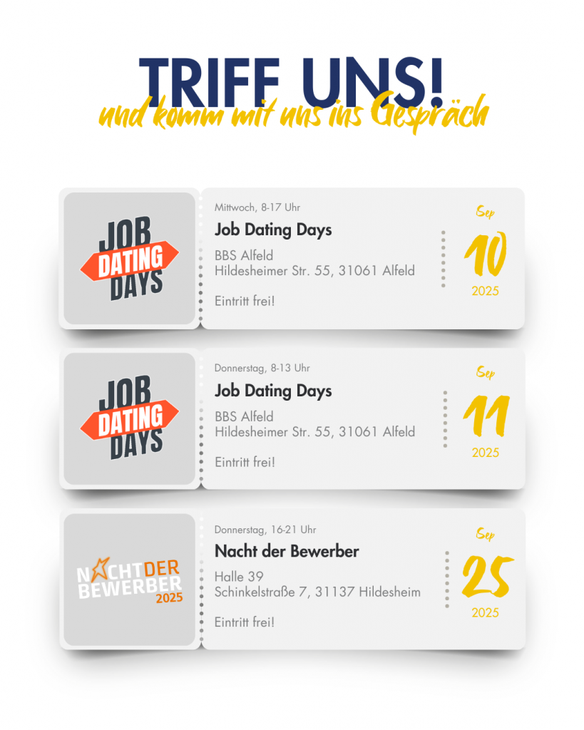 Triff uns!Elena Gielians28. August 2025Allgemein Du hast Interesse und möchtest gerne mit uns in Gespräch kommen? Bei den Job Dating Days in Alfeld am 10. und 11. September und bei der Nacht der Bewerber am 25. September kannst du uns persönlich kennenlernen und all deine Fragen loswerden!